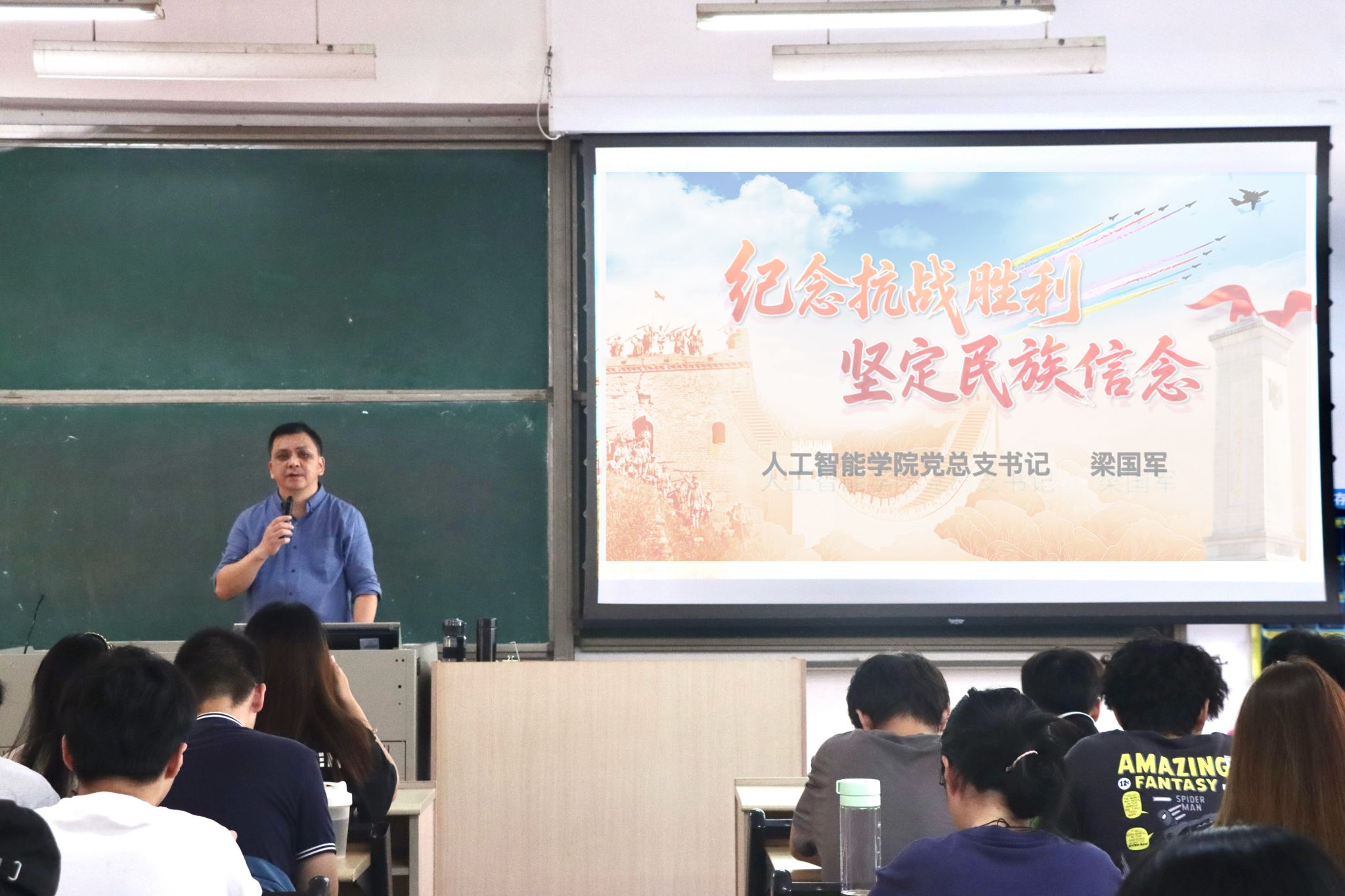 为深入学习贯彻习近平总书记关于弘扬伟大抗战精神的重要论述,落实立德树人根本任务,强化学生理想信念教育和爱国主义教育,10月31日,人工智能学院党总支书记梁国军在中山校区教学楼A402,以“传承抗战精神 坚定民族信念”为题,为我院2024级计算机网络技术专业学生讲授了一堂生动深刻的《形势与政策》思政课。