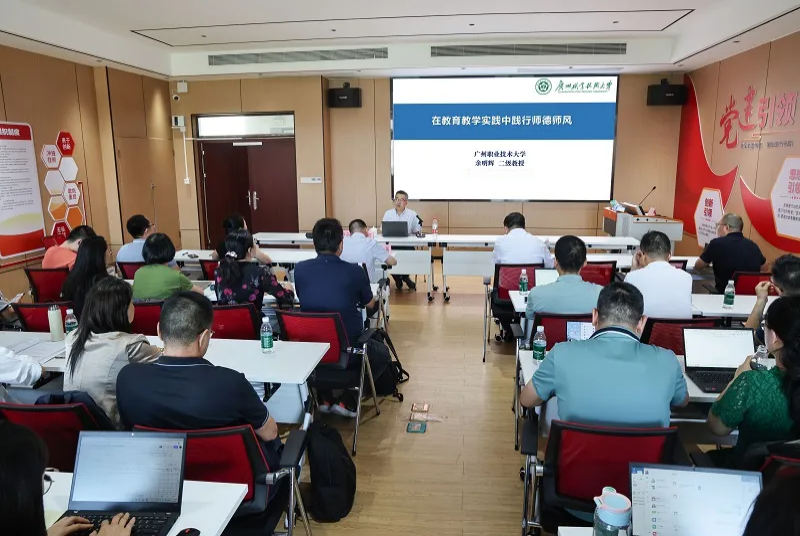 会上,余明辉以“在教育教学实践中践行师德师风”为主题,深入解读新时代“四有”好教师、“四个引路人”与“四个相统一”的辩证关系,结合国务院《关于弘扬教育家精神的意见》及“双高计划”双师队伍建设要求,立足生成式AI重塑教育生态的背景,提出教师角色转型的三条实施路径,为数字时代师德建设锚定新坐标。