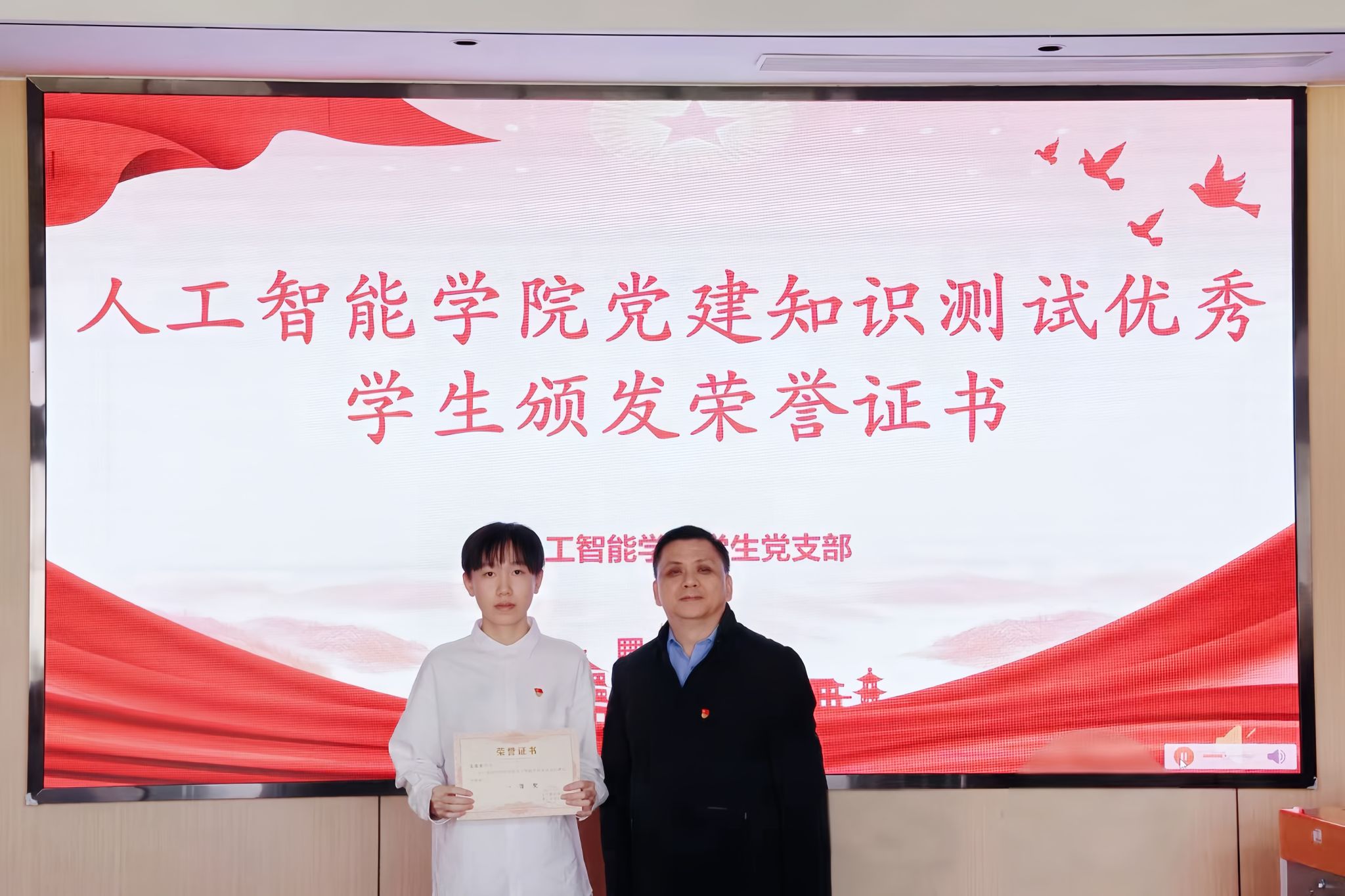 会议第一议题,学生党员许妍领学习近平总书记视察广东和出席第十五届全国运动会开幕式重要讲话重要指示精神。随后,会议进入学院党建知识测试优秀学生表彰环节,梁国军、林维嘉分别为测试优秀学生颁发荣誉证书,表彰先进、树立典型,进一步激发学生学习党的理论知识的热情,筑牢思想根基。